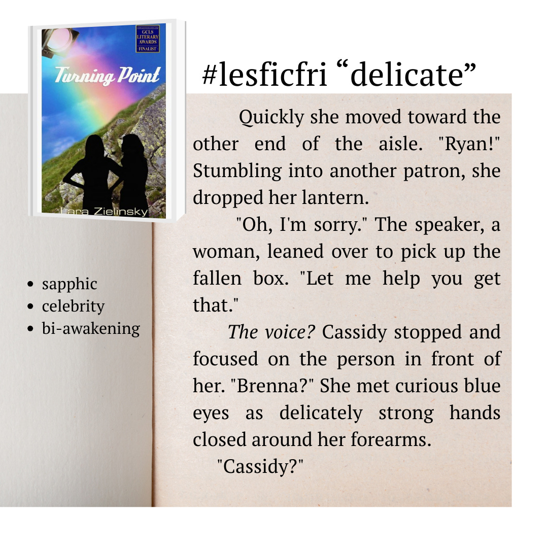 This newsletter is coming out on a Friday, so I thought I’d share with you the excerpt I selected for this week’s theme word “delicate”. From Turning Point, here’s an early moment of connection between Cassidy and Brenna: